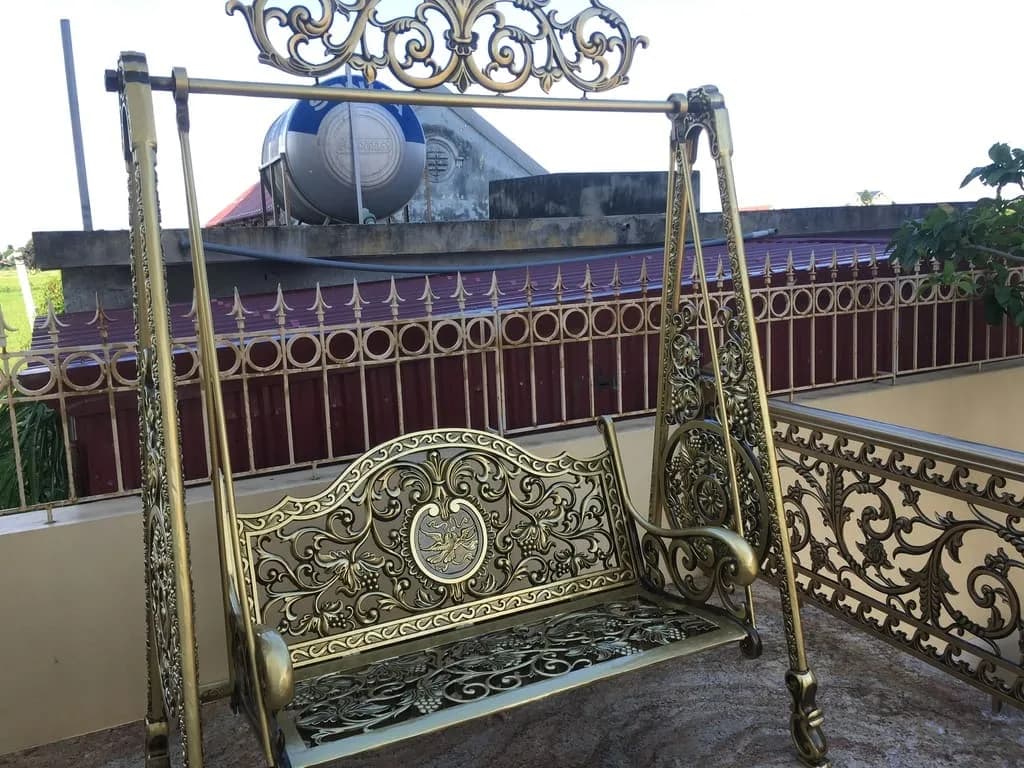 - Xích đu nhôm đúc không chỉ là sản phẩm tiện ích mà còn là điểm nhấn trang trí ấn tượng cho không gian sân vườn hoặc hiên nhà. Sản phẩm mang đến vẻ đẹp nghệ thuật, góp phần làm cho không gian trở nên sang trọng và độc đáo.